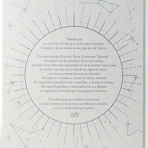 En esta entrega Eduardo Pérez Contreras “Spooky”, mensajero de las plantas y de la naturaleza, canaliza trece historias inspiradas en las primeras trece lunas de Lucas -un año en la vida de su segundo hijo-, en donde revela secretos profundos del espíritu humano a través de textos dotados de extraordinaria sencillez y sabiduría, y donde la artista fantástica, Mariana Magdaleno, materializa en sus dibujos el resplandor celestial que impregna la creación.