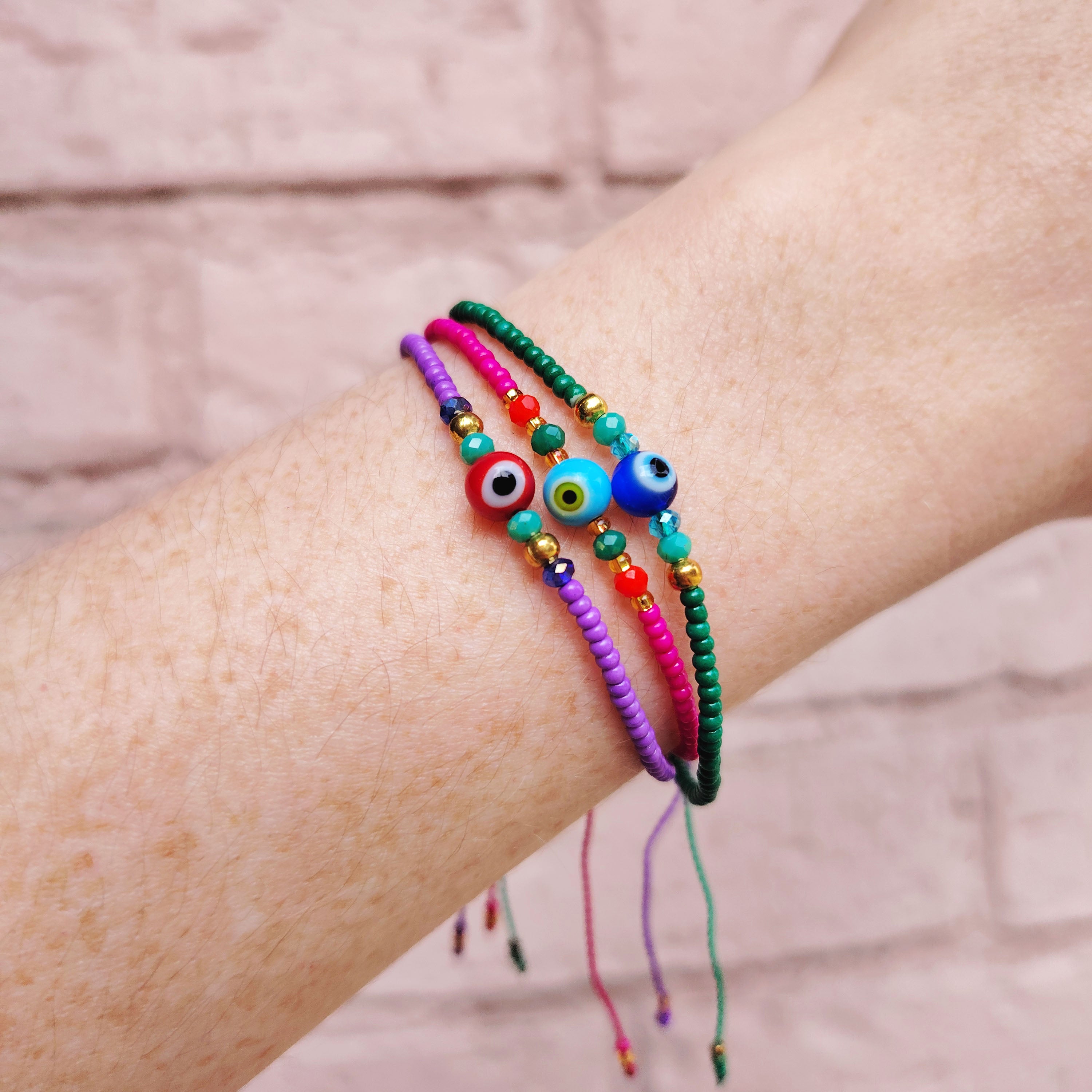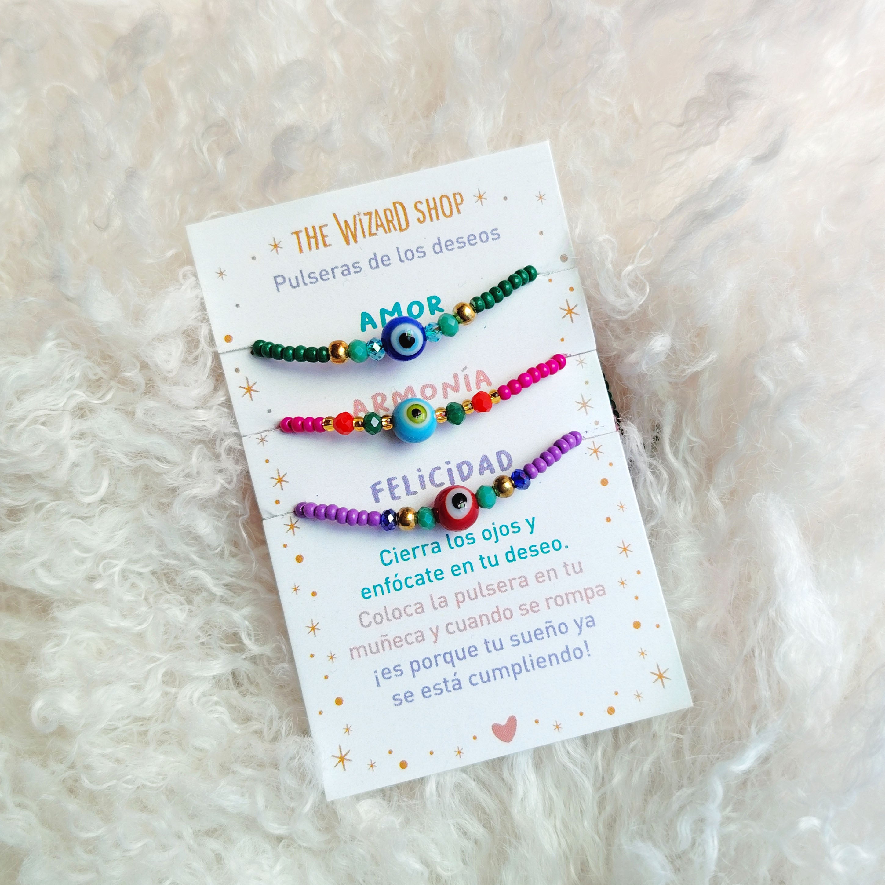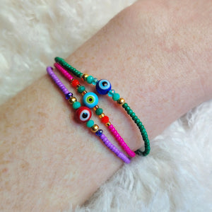 Esta pulserita hecha con cristalitos e hilo de colores es ajustable a todas las medidas. Tiene un ojito protector y viene en un cartoncillo con un mantra para que lo repitas cada vez que veas tu pulserita.